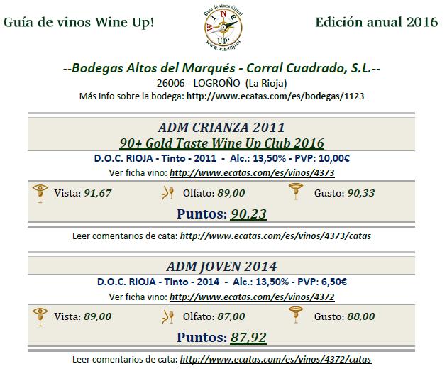 ADM crianza 2011 y ADM joven 2014 consiguen 90 y 87 puntos en la Guía Wine UP 2016